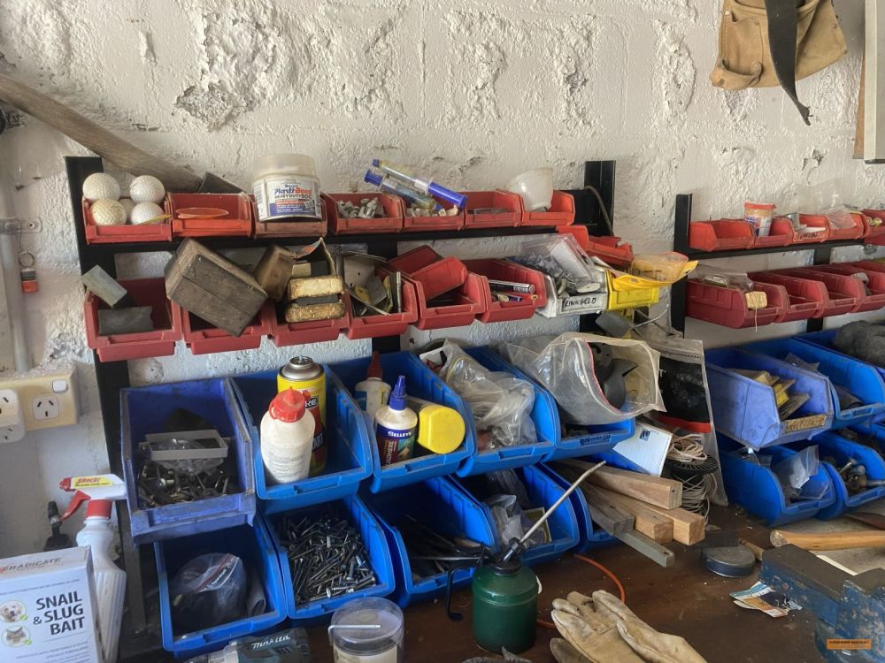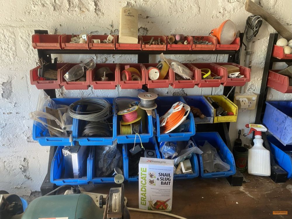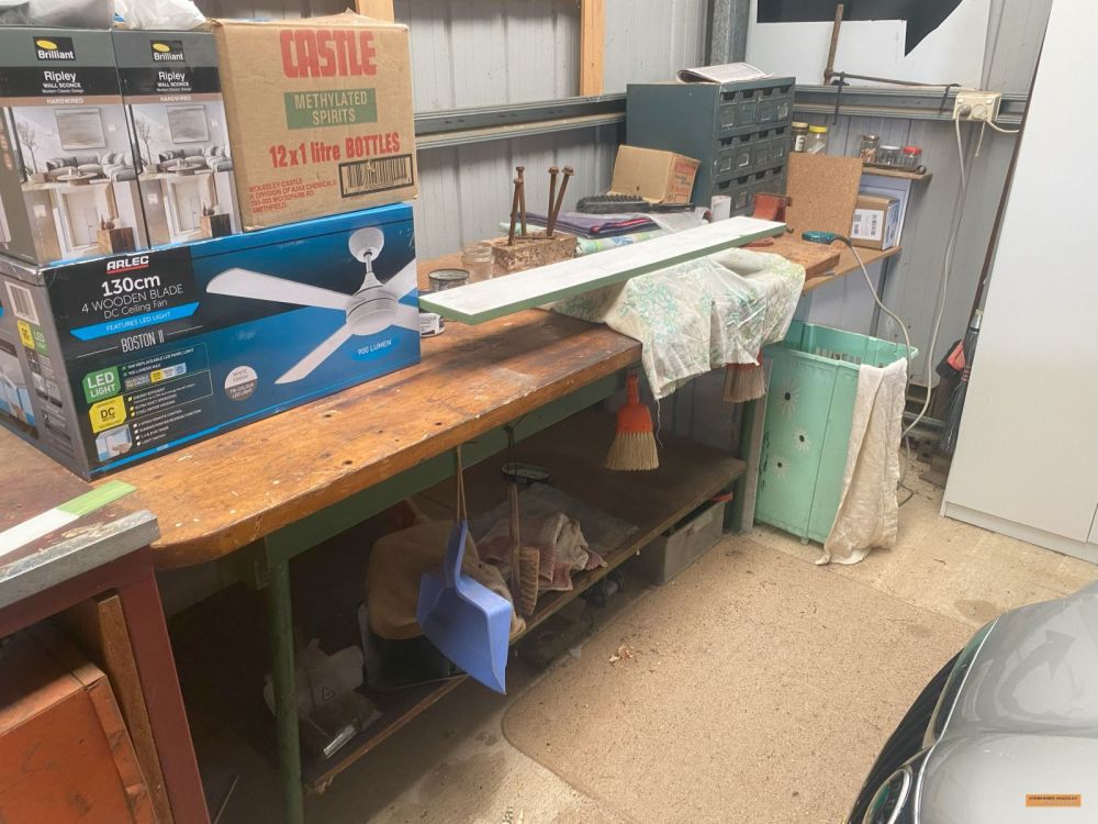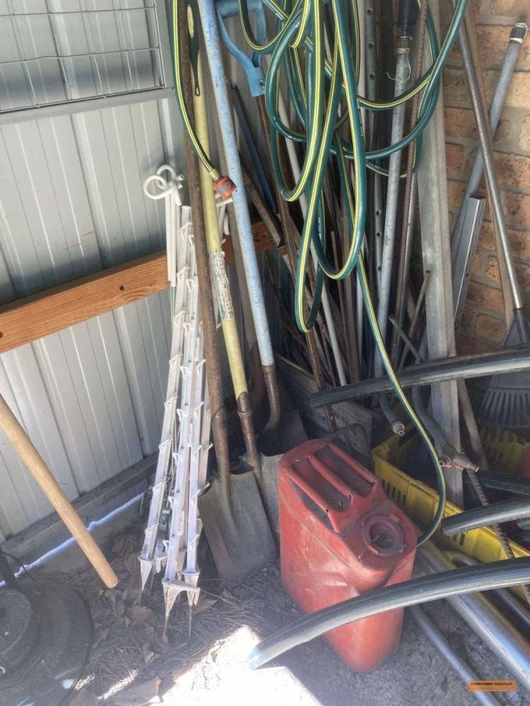 | Building Materials, Workshop Equipment & Tools | 2 x Work benches; Metals frames; Metal shelving; Jerry cans; Cement mixer; Ladders; 100m 15amp power cord; Painters planks; Timber rails; Palings; Poly pipe; Pipe fittings; Pressure washer; Assorted tools; Trolley jack; Scaffolding; |